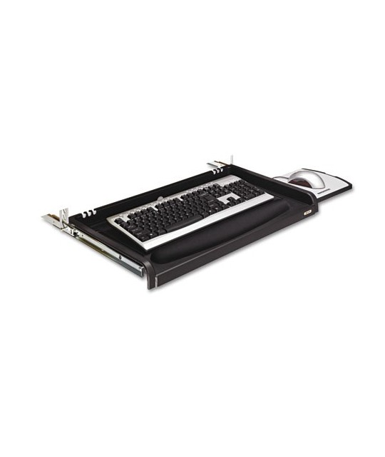 Features three height positions on a track with ball-bearing hardware ensures smooth operation. Extra-wide tray accommodates virtually all keyboards. Includes a leatherette gel wrist rest with anti-microbial protection and 3M
